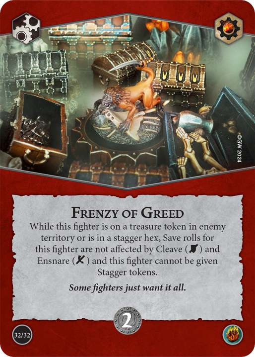 當此鬥士位於敵方領地的寶藏指示物或蹣跚格,且這個鬥士不受砍劈跟誘捕引響且不能被給予蹣跚指示物。